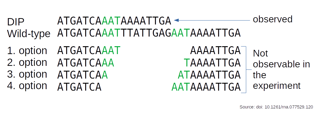 The actual start and end point of a DelVG that has a direct repeat longer than 0 can not be determined certainly. In the given image a direct repeat of length 3 is depicted. There are four possible ways on how it could have been created during the experiment. If n is the length of the direct repeat, there are always n+1 options on how it could have been created.